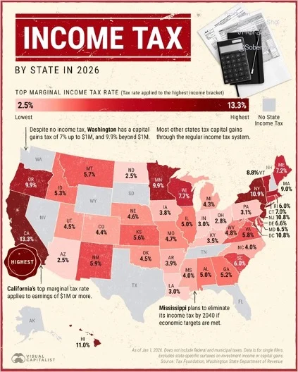 Here is a look at the top marginal income tax rates in the US by state.