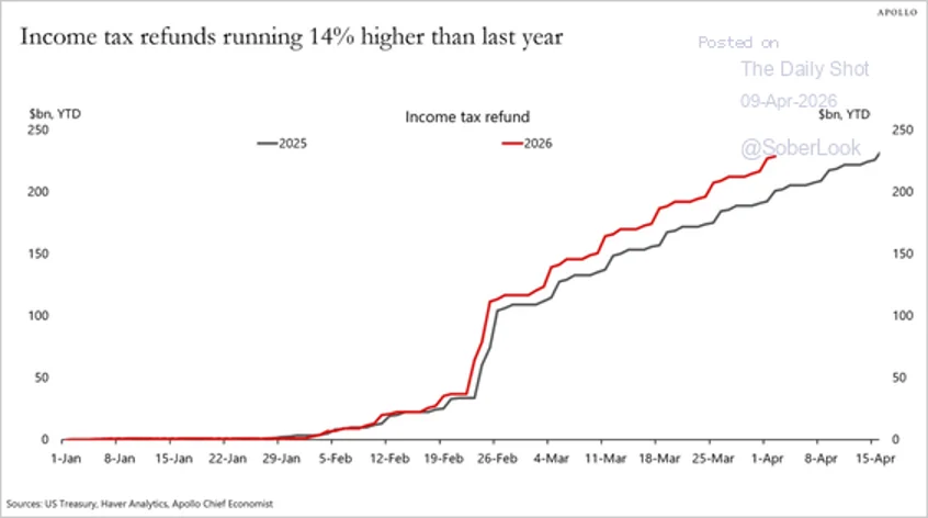 Tax refunds are running 11% ahead of prior-year levels, buffering the impact of higher oil prices.