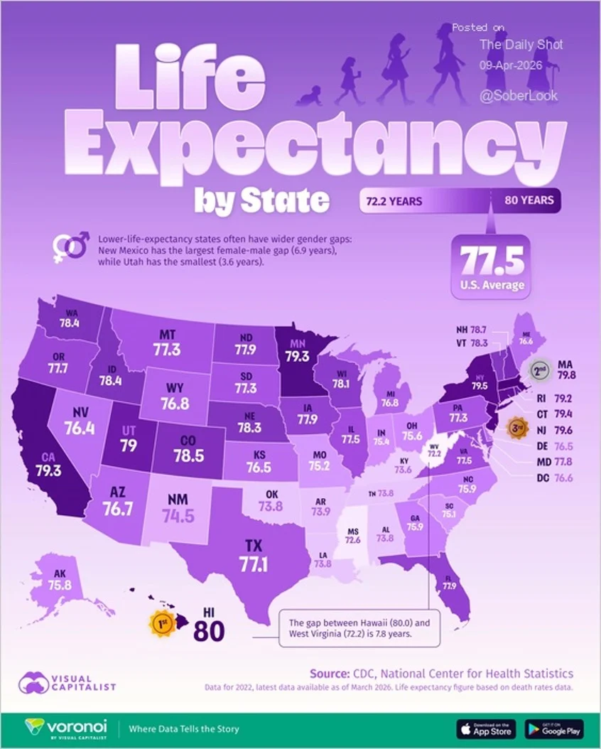 This map shows the life expectancy by US state.
