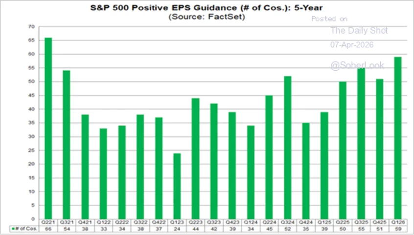 Growth in forward EPS has been accelerating. So far, 110 companies in the S&P 500 Index have issued Q1 EPS guidance, and 59 of them were positive. The percentage, 54%, is the highest in five years.