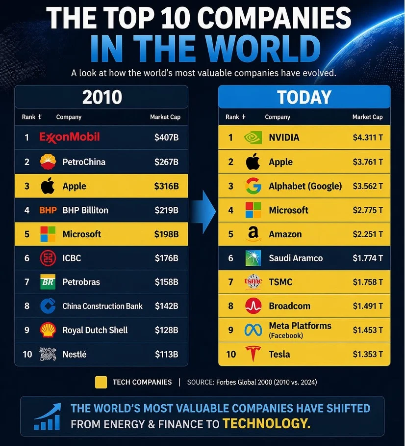 Look at the world’s most valuable companies. In 2010 just two of the top ten were “tech” companies. Now tech is 9/10!