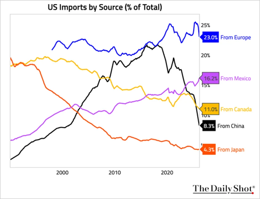 Direct imports from China as a share of total have fallen precipitously.